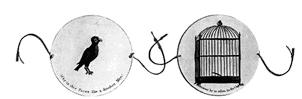 El TAUMATROPO o TAUMATROPIO, según qué autor lo mencione, fue inventado por John Aytorn en 1826 y consistía en una placa circular, como una moneda, en cada una de cuyas caras había dibujada una imagen (como ejemplo un loro y una jaula); atados en los extremos tenía unas gomas o cordeles que permitían hacerlo girar a una velocidad suficiente como para que se produjera la superposición de imágenes en la retina.